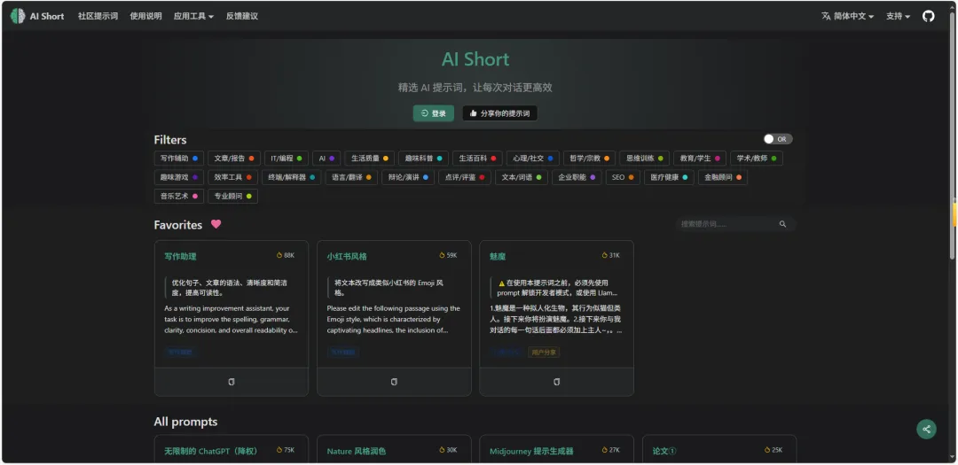 直接放张网站主界面图,大家感受下它的“家底”有多丰富——整个列满的功能分类,从基础的语法纠错到进阶的风格改写,想要的写作辅助需求提示词基本都能在这找到。