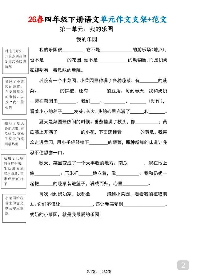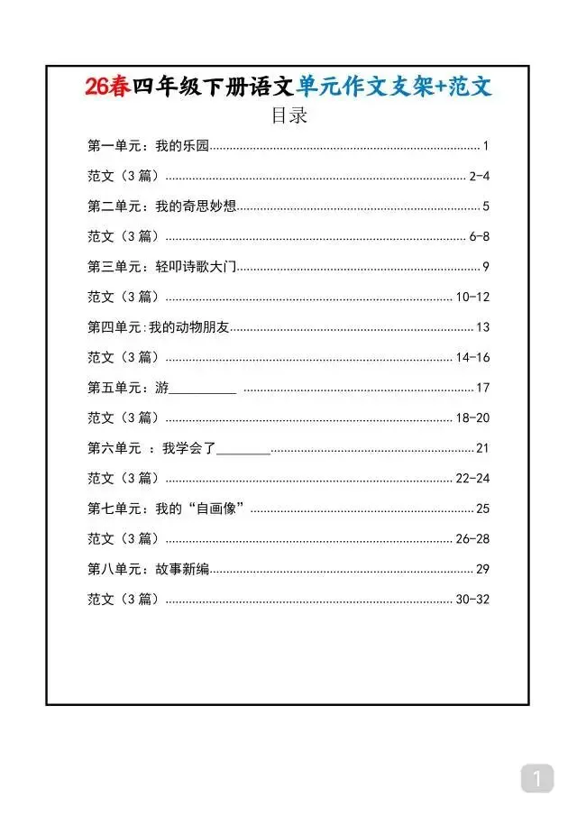 26春四年级下册语文1-8单元作文支架+范文,紧扣教材全单元作文考点,每单元配套实用写作支架+3篇优质范文,支架拆解写作结构、提炼核心句式,范文贴合四年级写作要求,语言生动。