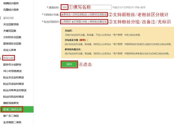进入创建渠道二维码后,根据页面上的提示完成操作,然后点击保存,支持公众号关注用户分组、修改备注名。