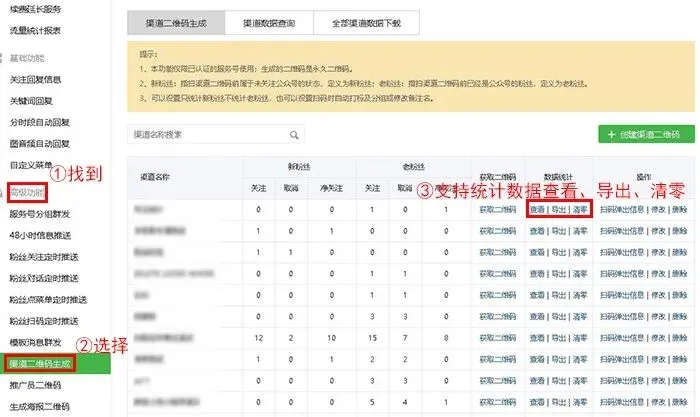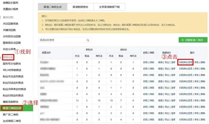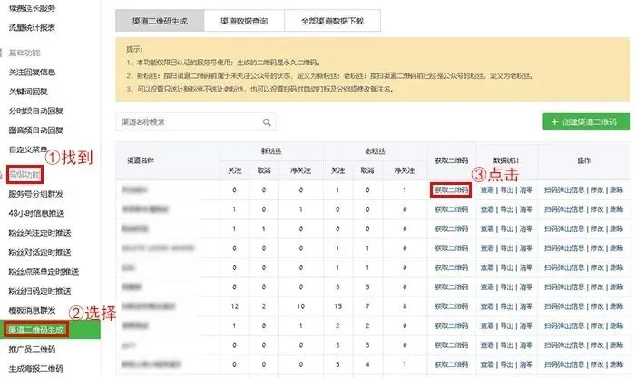 进入功能管理后,找到高级功能,然后选择渠道二维码生成,最后点击创建渠道二维码,支持微信公众号生成带参数二维码功能。