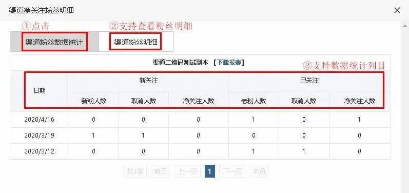 ⒋保存成功后,找到对应渠道名称,点击查看,支持查看用户的关注和取关数据,支持查看用户分组的明细数据。