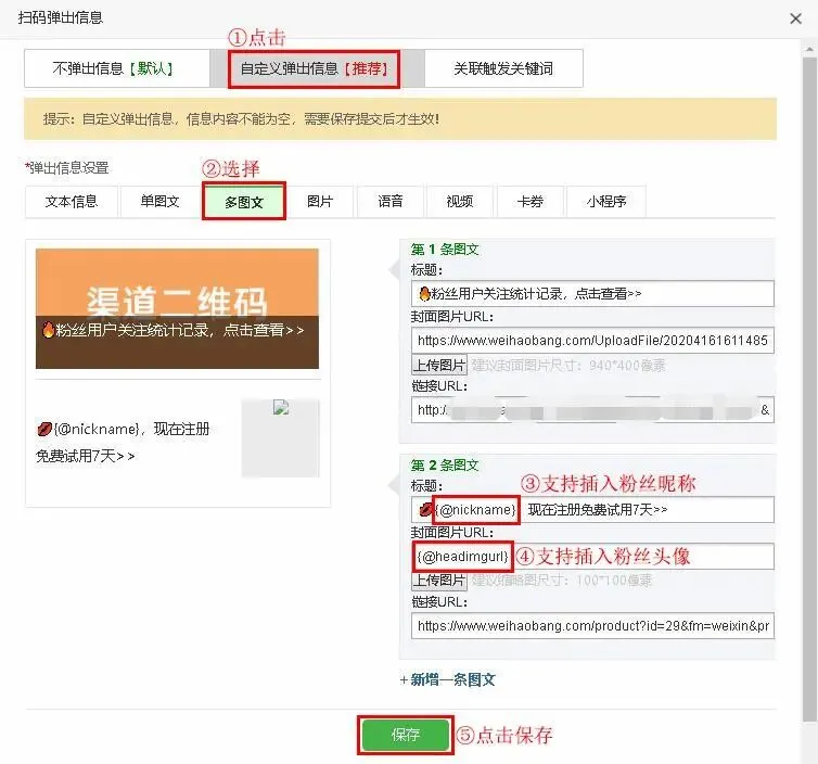 ⒌进入渠道二维码生成后,找到对应渠道名称,然后点击扫码弹出信息,支持自定义文本\单图文\多图文\视频\图片\语音\卡券\小程序类型,关联触发关键词回复功能中的关键词。