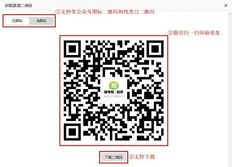 ⒍进入渠道二维码生成后,找到对应渠道名称,然后点击获取二维码,支持下载带公众号图标的带参数二维码,纯黑白的带参数二维码。现微号帮平台所有功能注册登录授权添加公众号,立即免费试用7天!