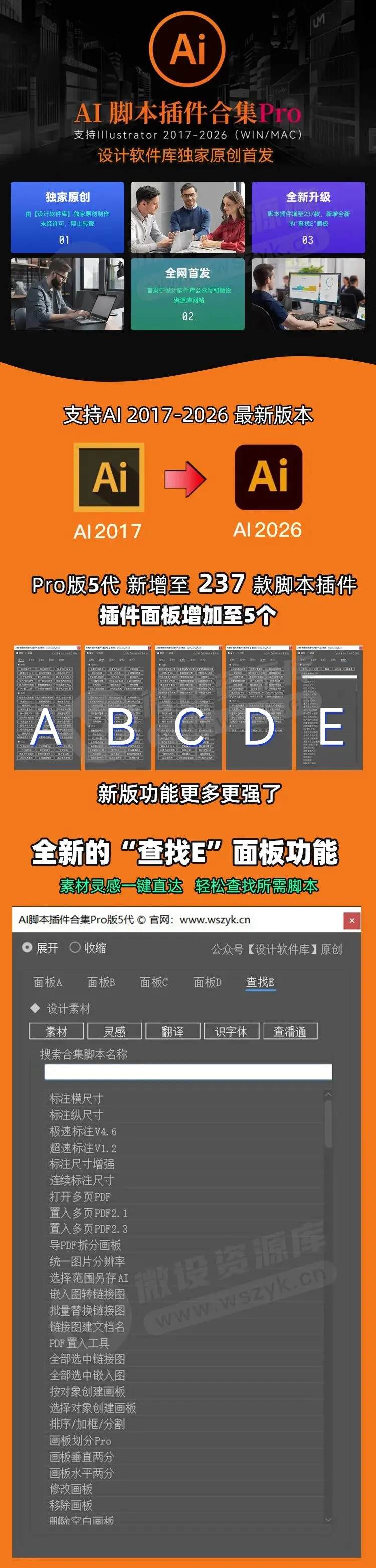设计软件库团队辛苦原创制作,全网首发AI脚本插件合集Pro版5代,内含237款脚本插件,面板增加至“ABCDE”