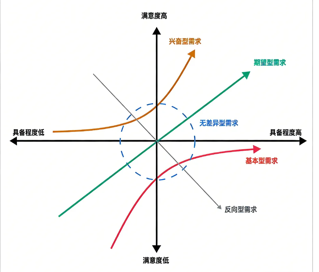 KANO模型是对用户需求分类和优先级排序的常用定性工具。它不直接告诉你哪个功能最重要,而是帮你分析功能实现程度与用户满意度之间的关系。