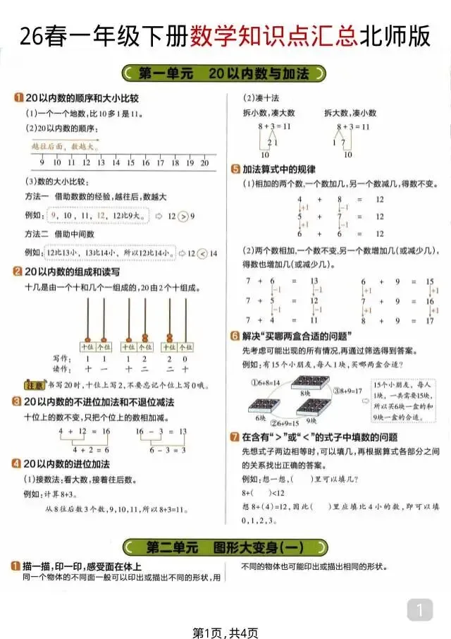 26春北师版一年级下册数学知识点汇总,紧扣教材六大核心单元,把20以内数的加减、100以内数的认识、平面图形等重点知识,按考点拆解成方法技巧、规律总结和例题解析,条理清晰、讲解通俗,还搭配实用解题思路和易错点拨,是孩子同步学练、夯实基础、梳理知识体系的优质资料。