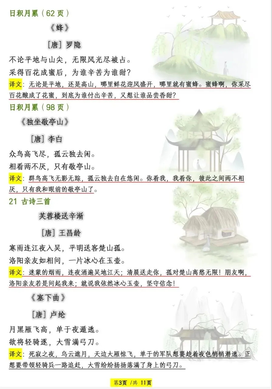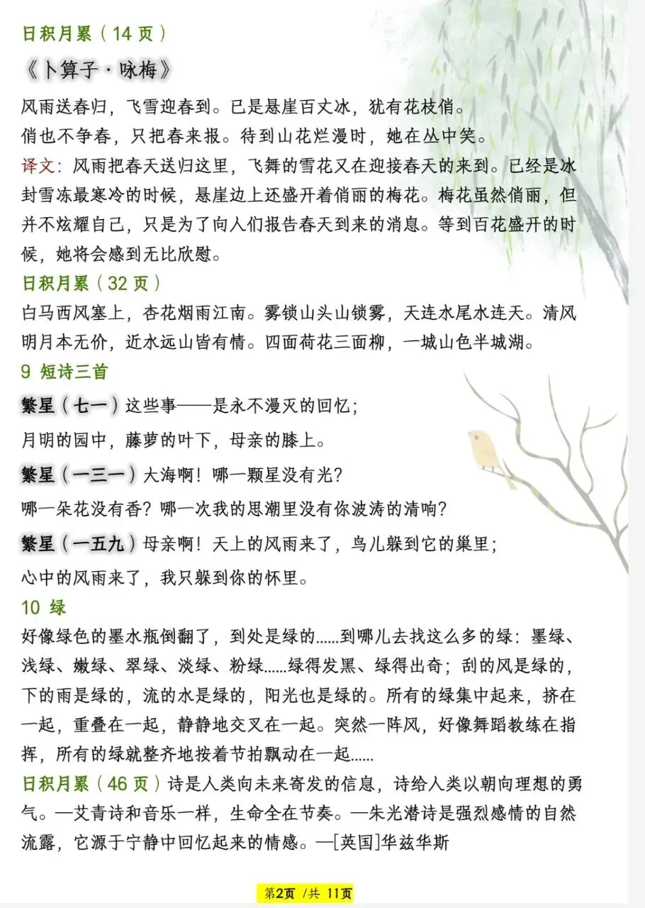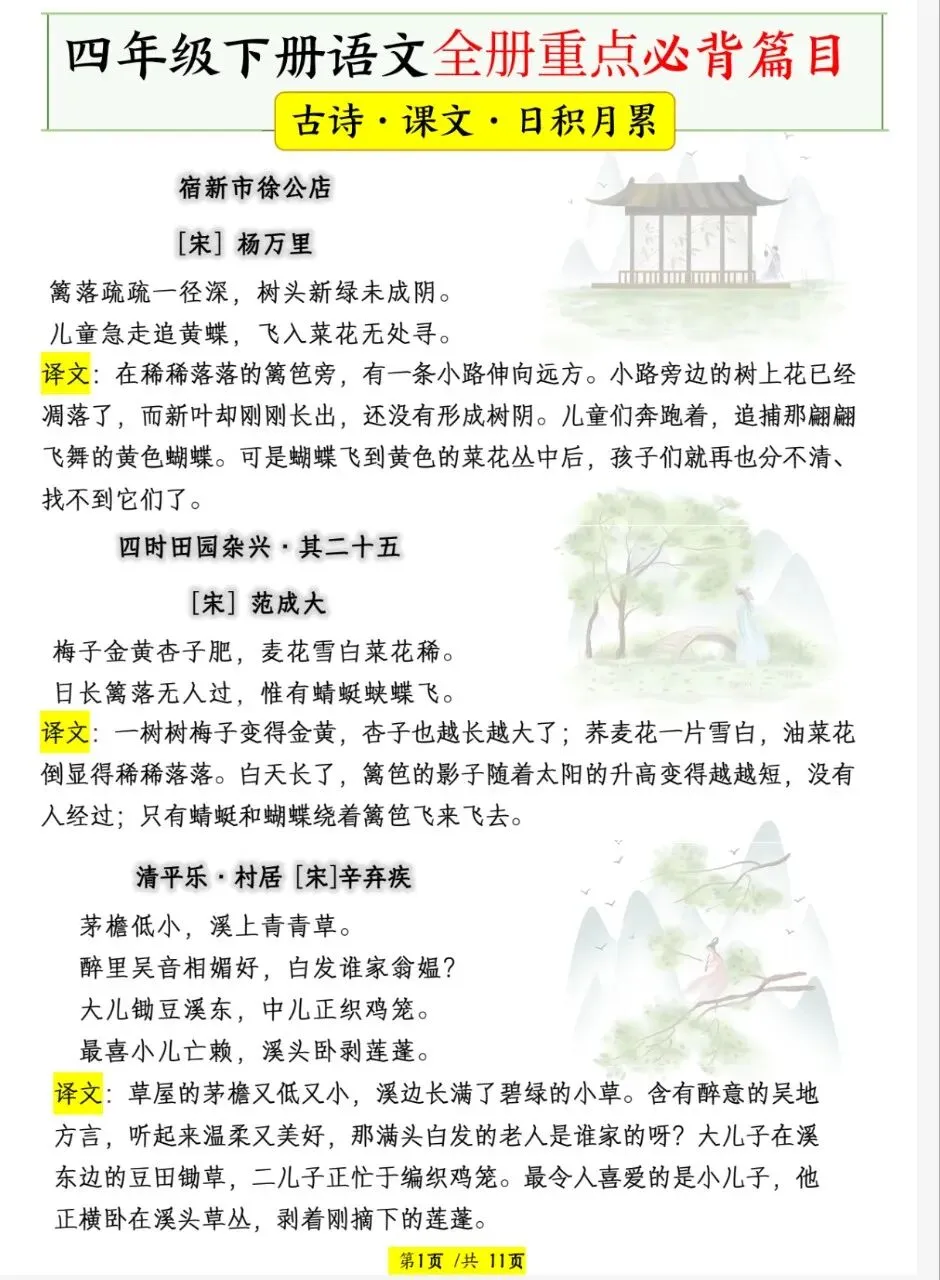 四年级下册语文必背篇目给你整理出来了,文末有完整版电子版免费领取