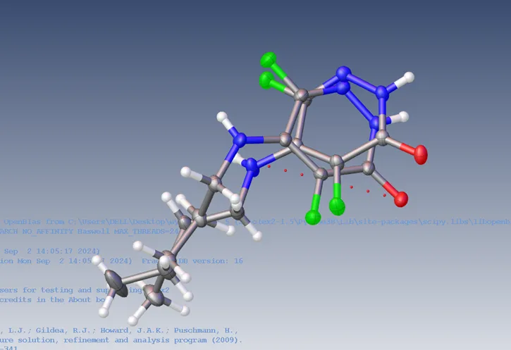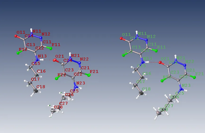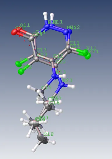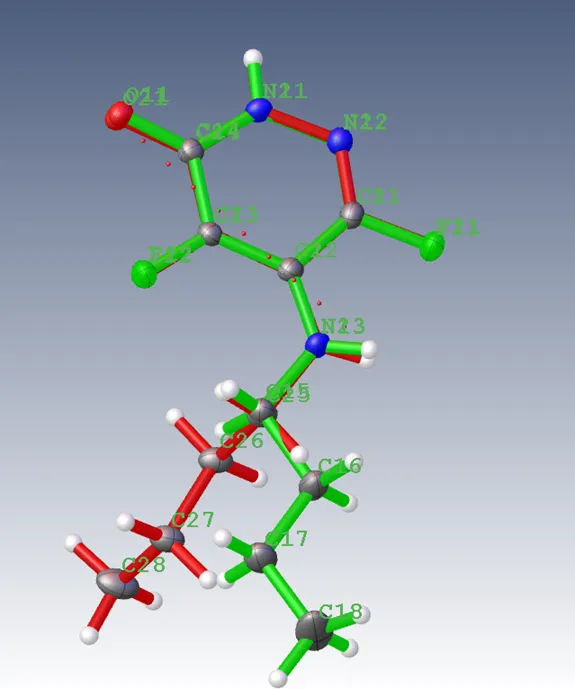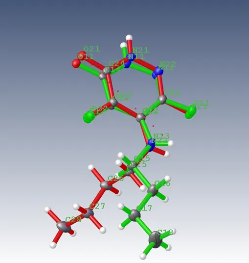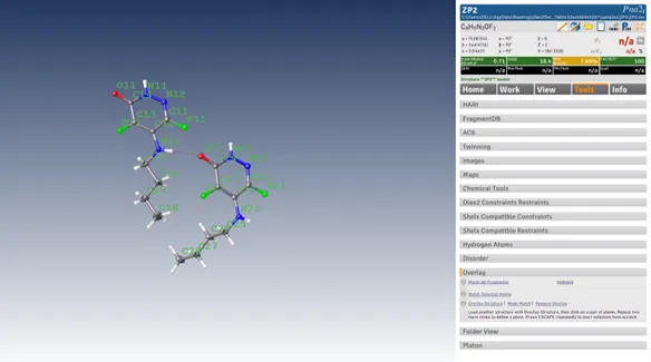 以Olex2中自带的ZP2文件为例进行叠合,此时不对称单元内的两个分子较分散,使用Tools->Overlays->Match All Fragments进行自动叠合。