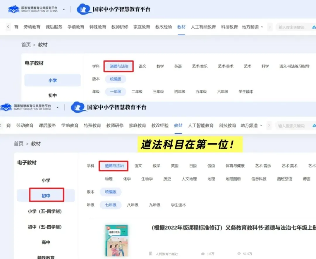 大家如果用【国家中小学智慧教育平台】就会发现一个细节:在所有小初科目里,道法赫然排在第一位!