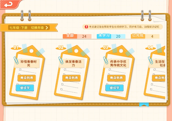 课程内容依据统编版教材打造,与学校课本完全同步,到章到节,覆盖初中道德与法治所有知识点,方便孩子系统学习。