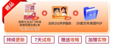 ① 价值99元的道德与法治7-9年级思维导图全册1本(预计4月发货) ② 价值499元的30天1v1专属伴学服务 ③ 50套道法历年中考真题PDF(电子版)