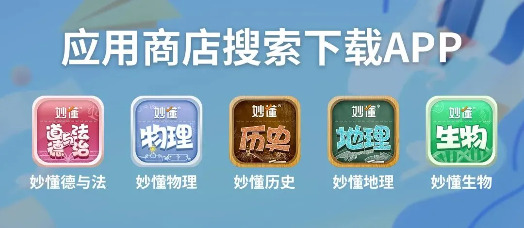 A:各大应用商城搜索下载:妙懂德与法/妙懂生物/妙懂物理/妙懂地理/妙懂历史,用下单手机号登录APP即可使用(下单后自动激活)。