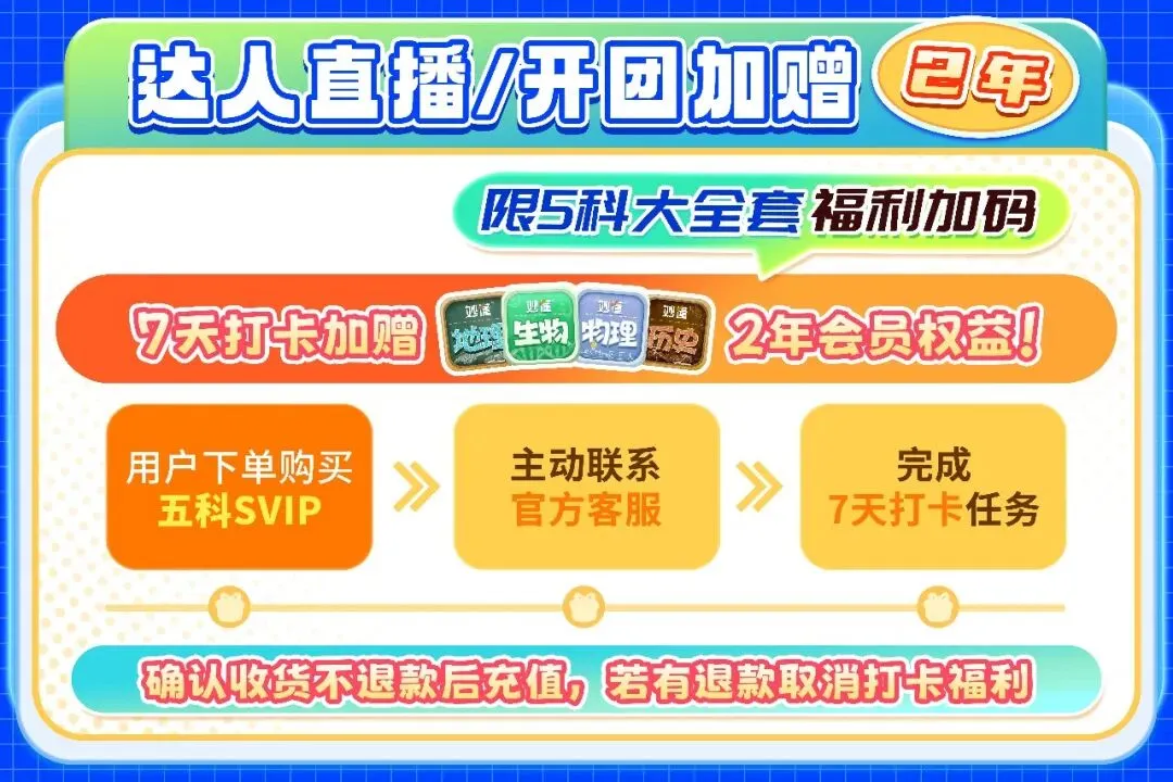 拍下五科大全套的家长,联系官方客服参与7天打卡,完成就再额外加赠史地物生四科 2 年会员!
