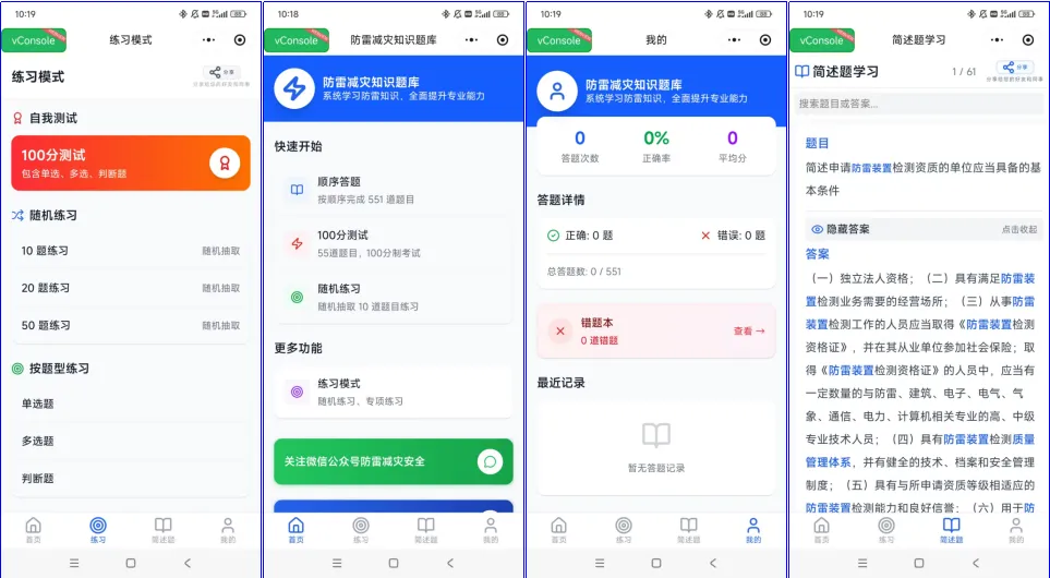 作为面向防雷检测、工程、安全管理等相关人员的专业工具,小程序涵盖学习、练习、测试、复习全流程,适配日常提升、考前备考、查漏补缺等多种场景,精准匹配你的学习需求。