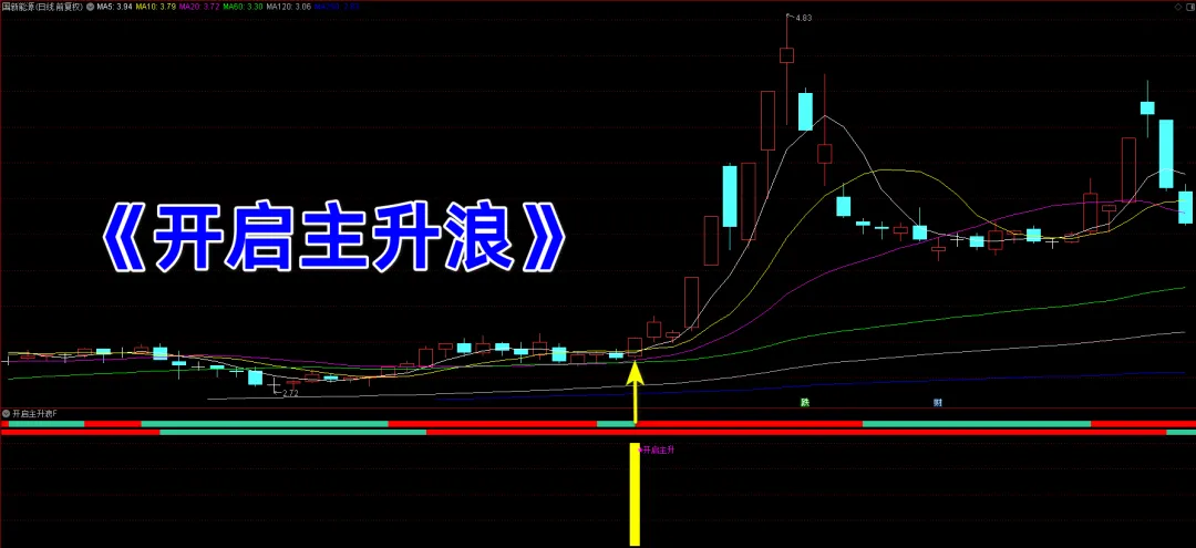 DRAWTEXT(人气,56,’ ★开启主升’),COLORFF00FF;