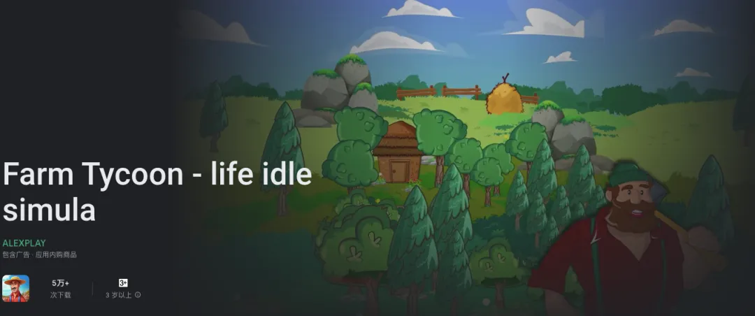 游戏名:《Farm Tycoon – life idle simula》类型: 模拟经营 + 放置点击 + 轻策略开发商: ALEXPLAY下载量: 5万+(Google Play估算接近10万) 评分: 4.2+(中等偏上)