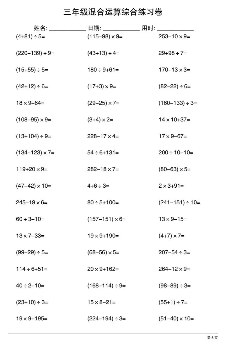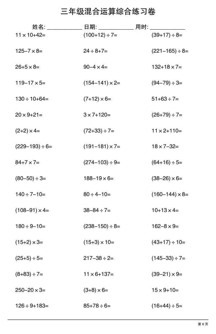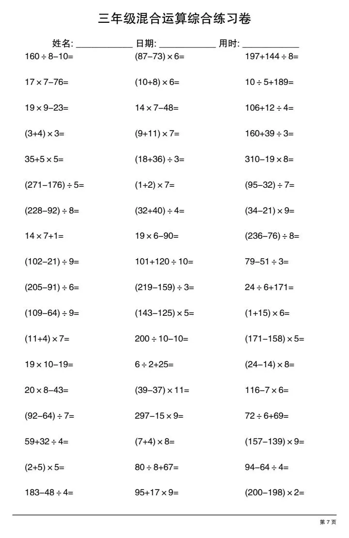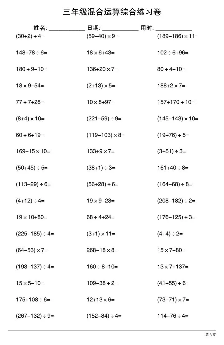 今日份分享三年级下册混合运算综合练习卷(完整电子版可打印)!这份资料已经整理成可打印版本,方便孩子随时翻看学习,建议家长先收藏,再转发给身边有需要的家庭,一起帮助孩子高效学习~