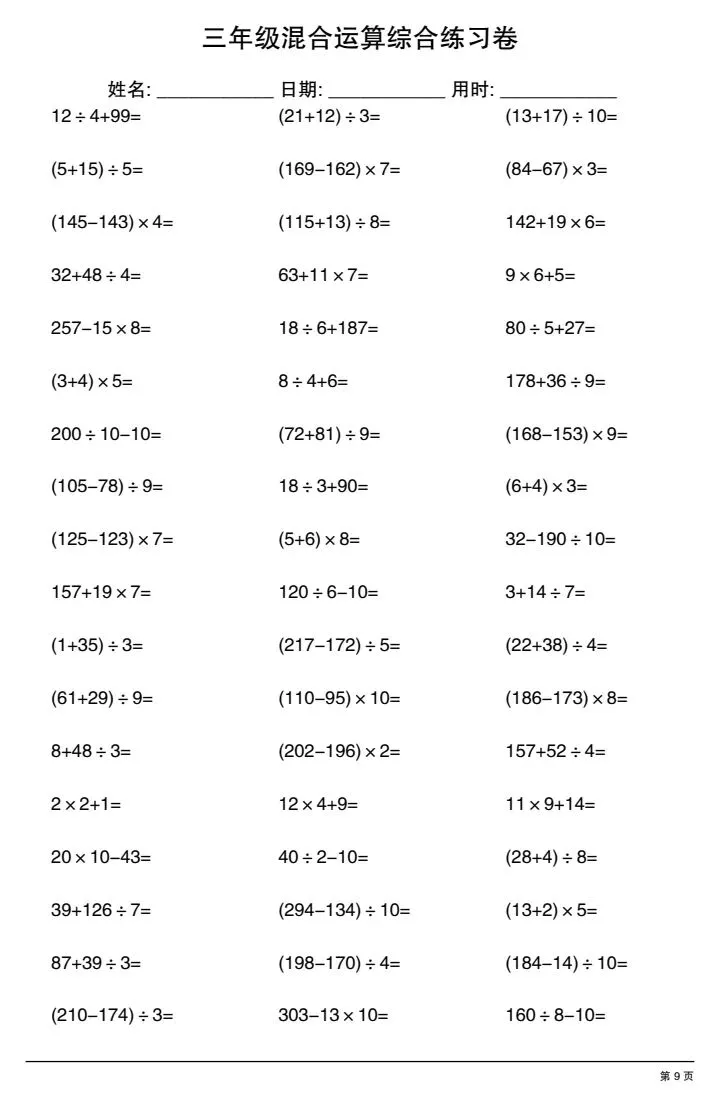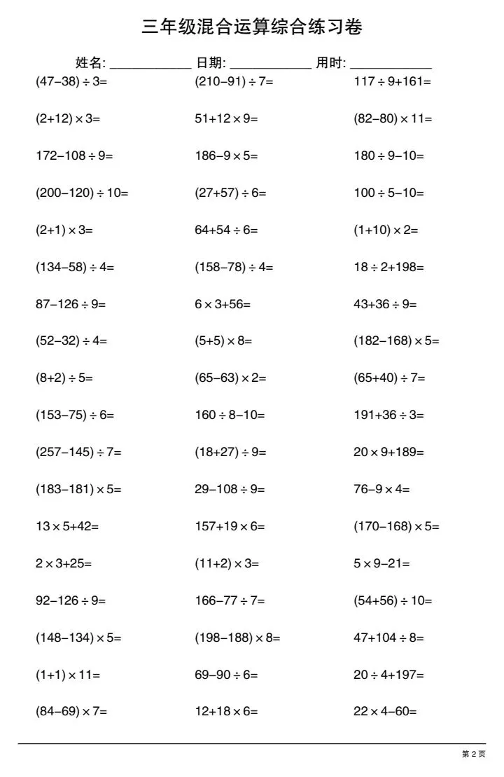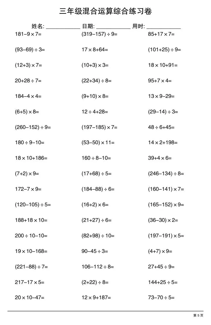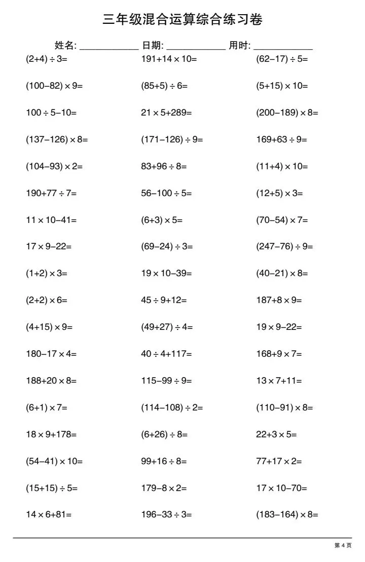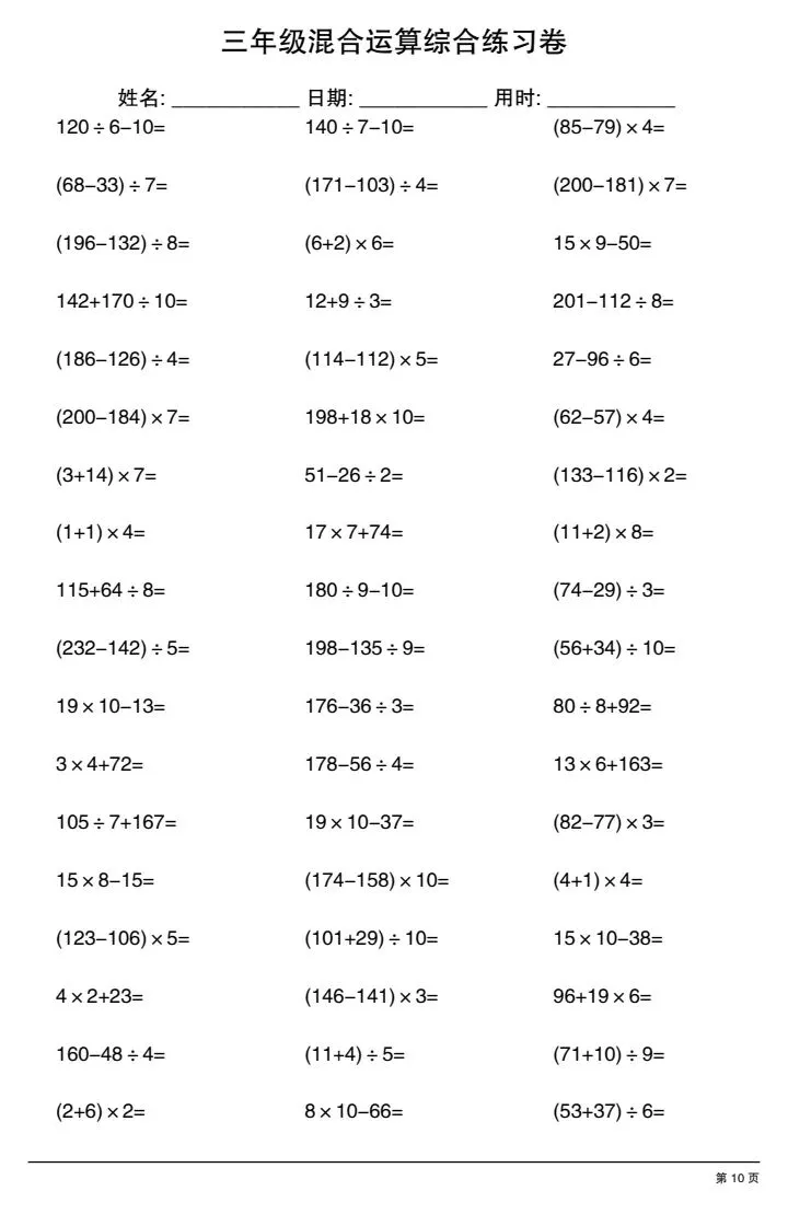 今日份分享三年级下册混合运算综合练习卷(完整电子版可打印)!这份资料已经整理成可打印版本,方便孩子随时翻看学习,建议家长先收藏,再转发给身边有需要的家庭,一起帮助孩子高效学习~
