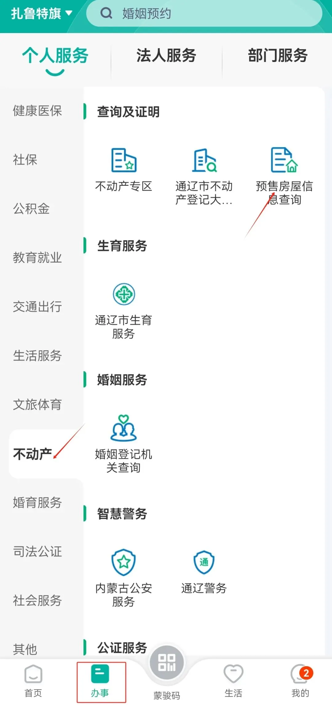【办事指南】蒙速办APP-预售房屋信息查询 一、打开手机“蒙速办”APP,区划选择扎鲁特旗,选择“办事” 二、下滑至“便民”,选择不动产专区预售房屋信息查询,确认授权,了解相关内容。 图文/编辑:邢呼达古拉 初审:贾翠红 复审:徐 群 终审:田 丽