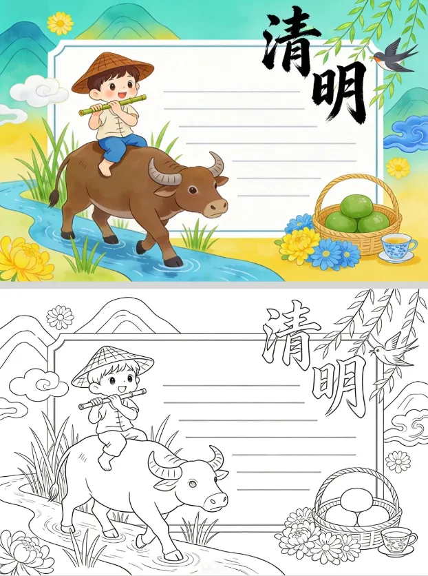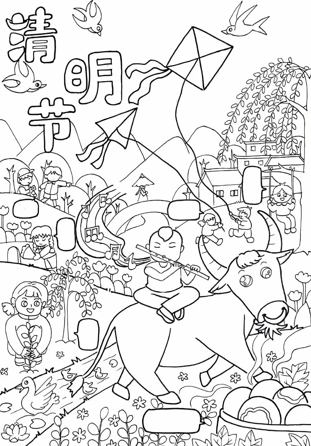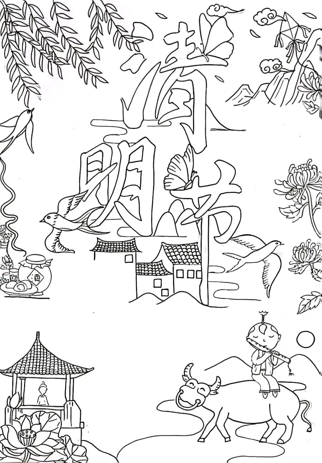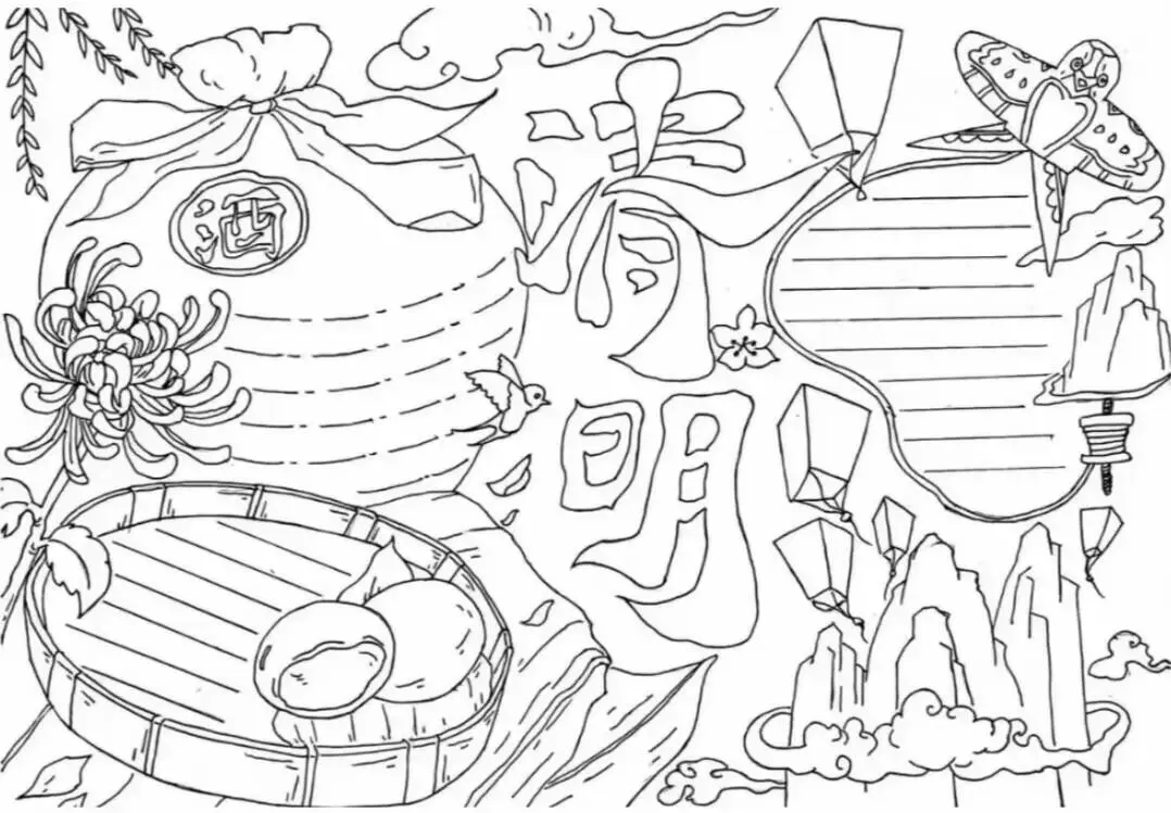清明节主题手抄报&主题绘画 简约黑白线稿图,传统节日手抄报模板,可打印直接涂色画画。清明节手抄报设计, 不仅是一项艺术创作, 也是对这个传统节日文化的一种传承。 可以帮助家长和孩子构思出既有教育意义又充满创意的手抄报!