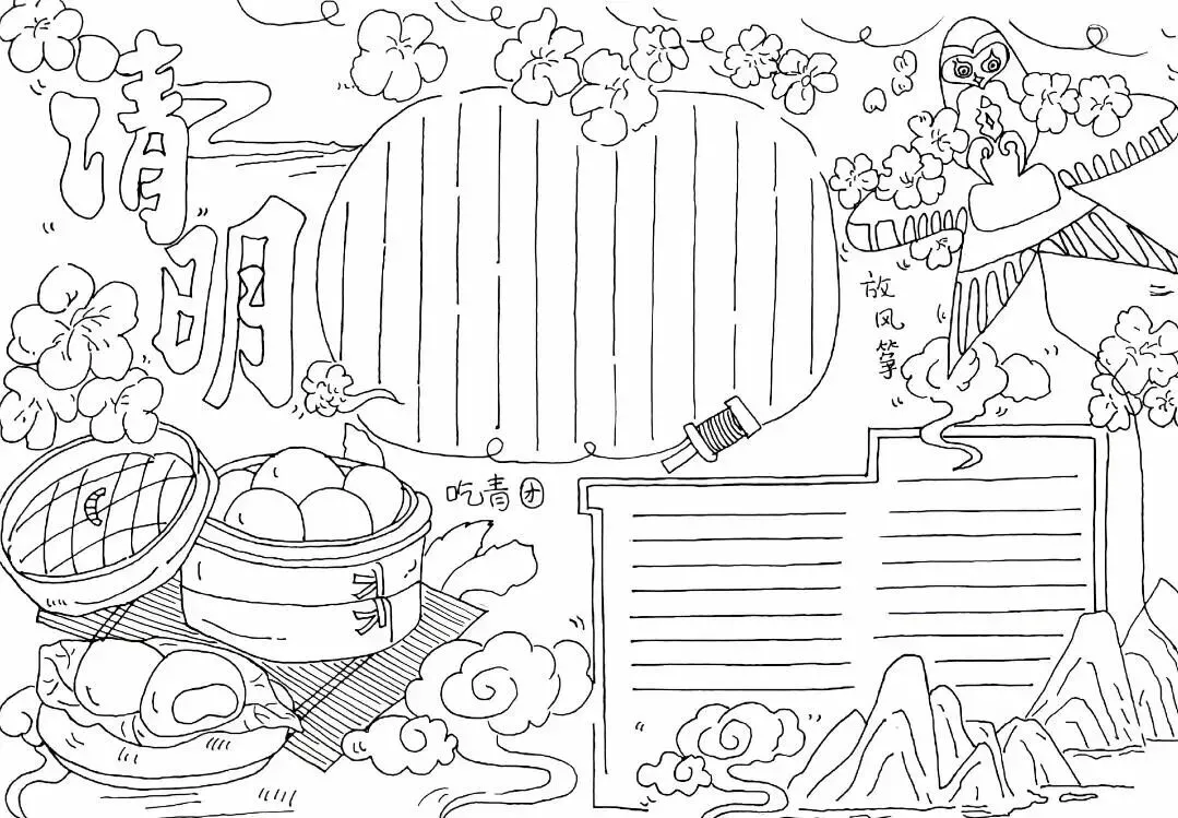 清明节手抄报大全「黑白线稿」可打印 适合一二三年级小学生涂色画画小报作业模板!