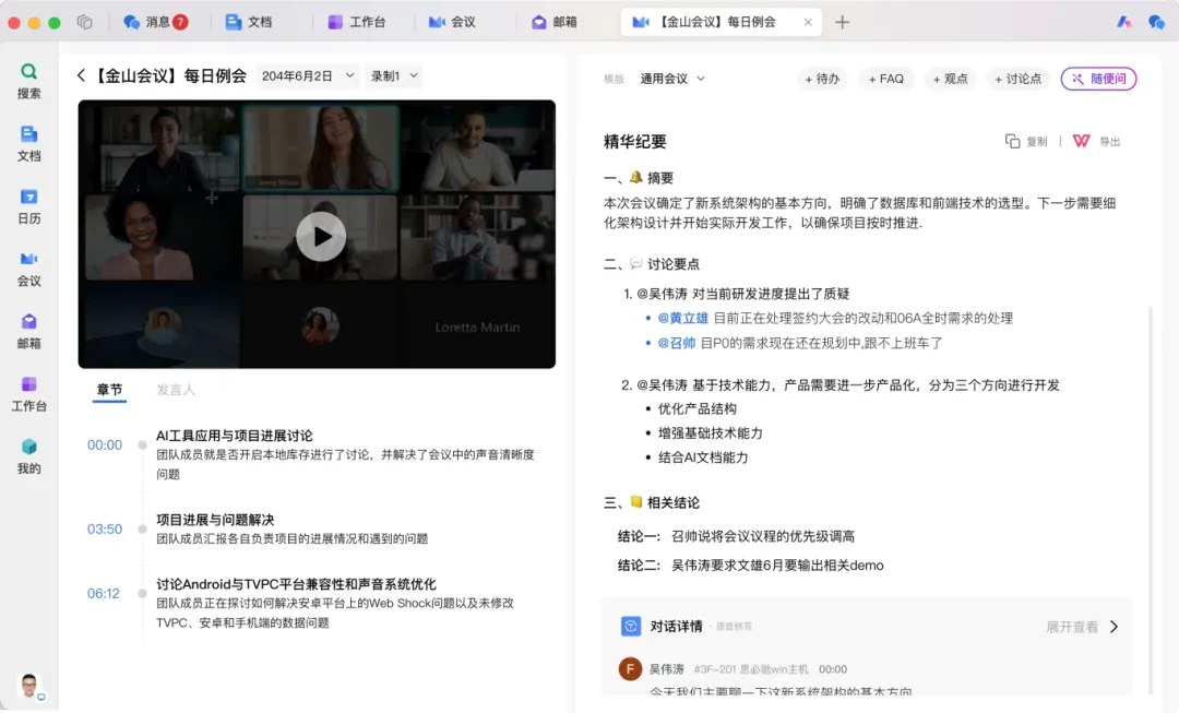 登录兰州大学专属账号可发起200人内,单次24小时上限会议,任何人均可加入会议。还具备AI会议纪要功能,不仅包含会议总结、章节划分,还能提炼重点内容并通过时间戳精准定位。