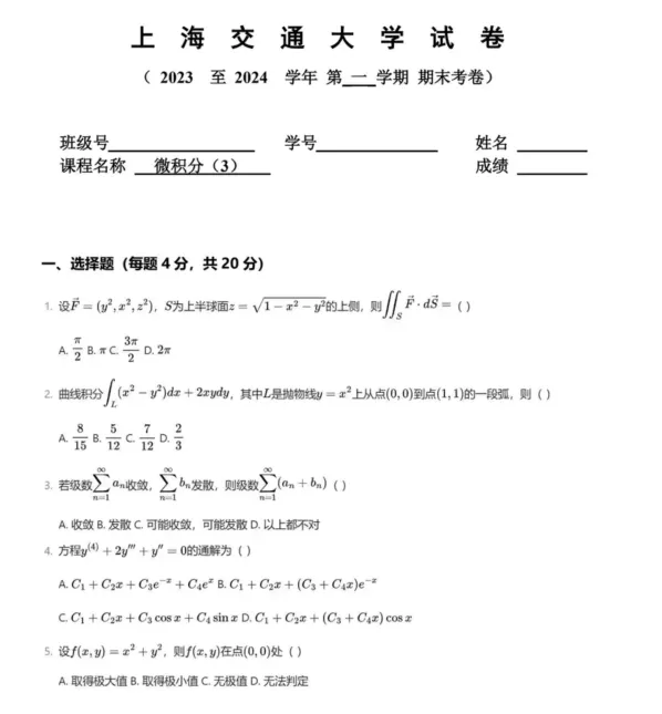 上海交通大学微积分三期末试题,可打印 获取更多考研资料可加小编QQ:3542263029或者v信kyzlfx 先点“赞+在看”联系客服即可免费赠送公共课(政治英语数学)资料 其他院校陆续更新中…….有需要联系客服留言即可 更多真题资料会第一时间为大家推送 还有其他年份,可联系客服详询 01 部分截图如下🔥 温馨服务 免责申明:资料整理于网络如有侵权请告知删除 长按并识别下方二维码关注公众号,不定时发放考研福利哦 扫一扫添加微信好友,获取更多考研信息哦~