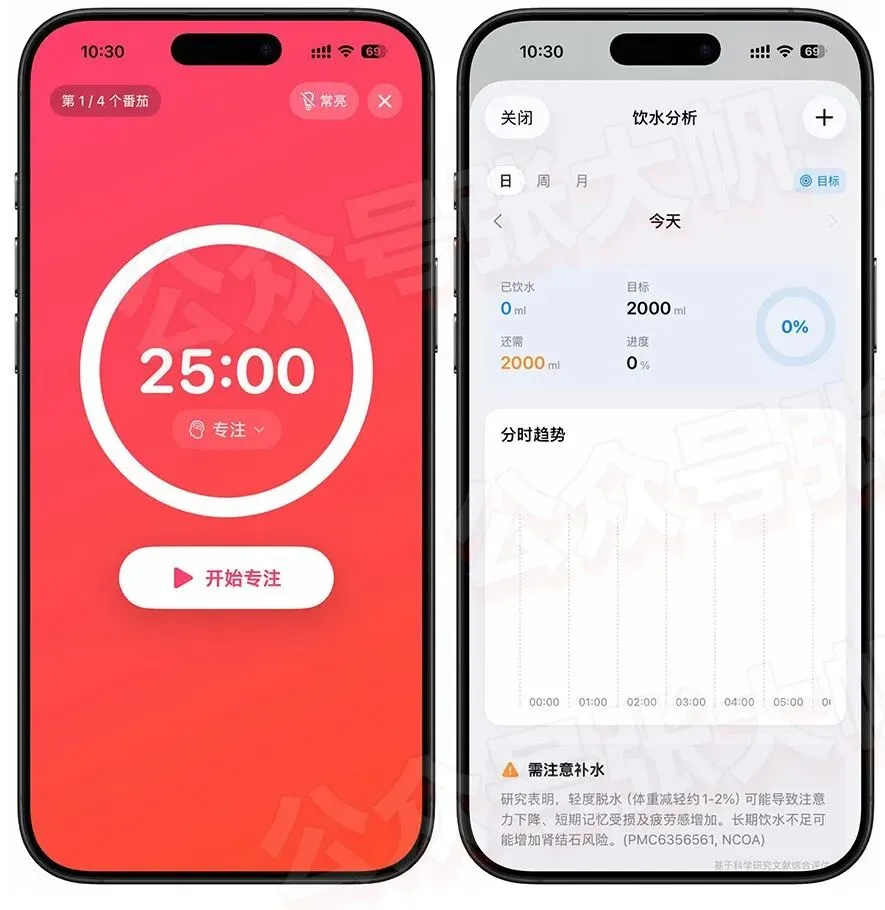 除了健康记录和提醒,软件还内置了番茄时钟、饮水咖啡记录、冥想和隐私运动记录等功能,一个APP即可完成多个APP的工作!