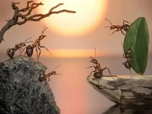 小型蚁筑巢,将湿润的土粒吐在巢口,垒成酒盅状、灶台状、坟冢状、城堡状或松疏的蜂房状,高耸在地面;中型蚁的巢口,土粒散得均匀美观,围成喇叭口或泉心的形状,仿佛大地开放的一只黑色花朵;大型蚁筑巢像北方人的举止,随便、粗略、不拘细节,它们将颗粒远远地衔到什么地方,任意一丢,就像大步奔走撒种的农夫。