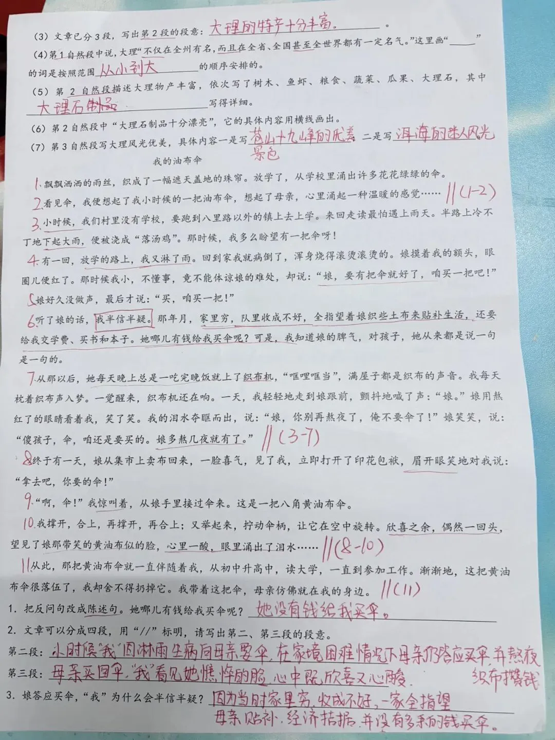 第三段:母亲为了给“我”买伞,不顾家境贫寒,日夜熬夜织布攒钱。
