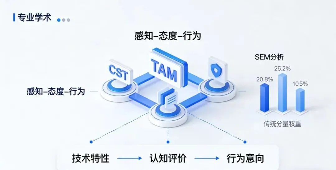 精准量化路径:通过SEM分析感知有用性、易用性等变量权重,为AI平台优化提供数据驱动的靶向策略。