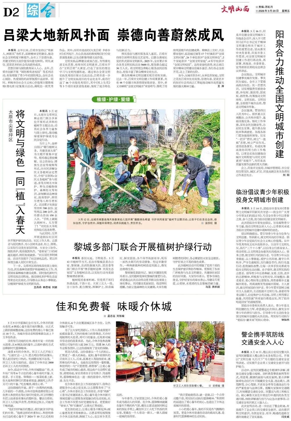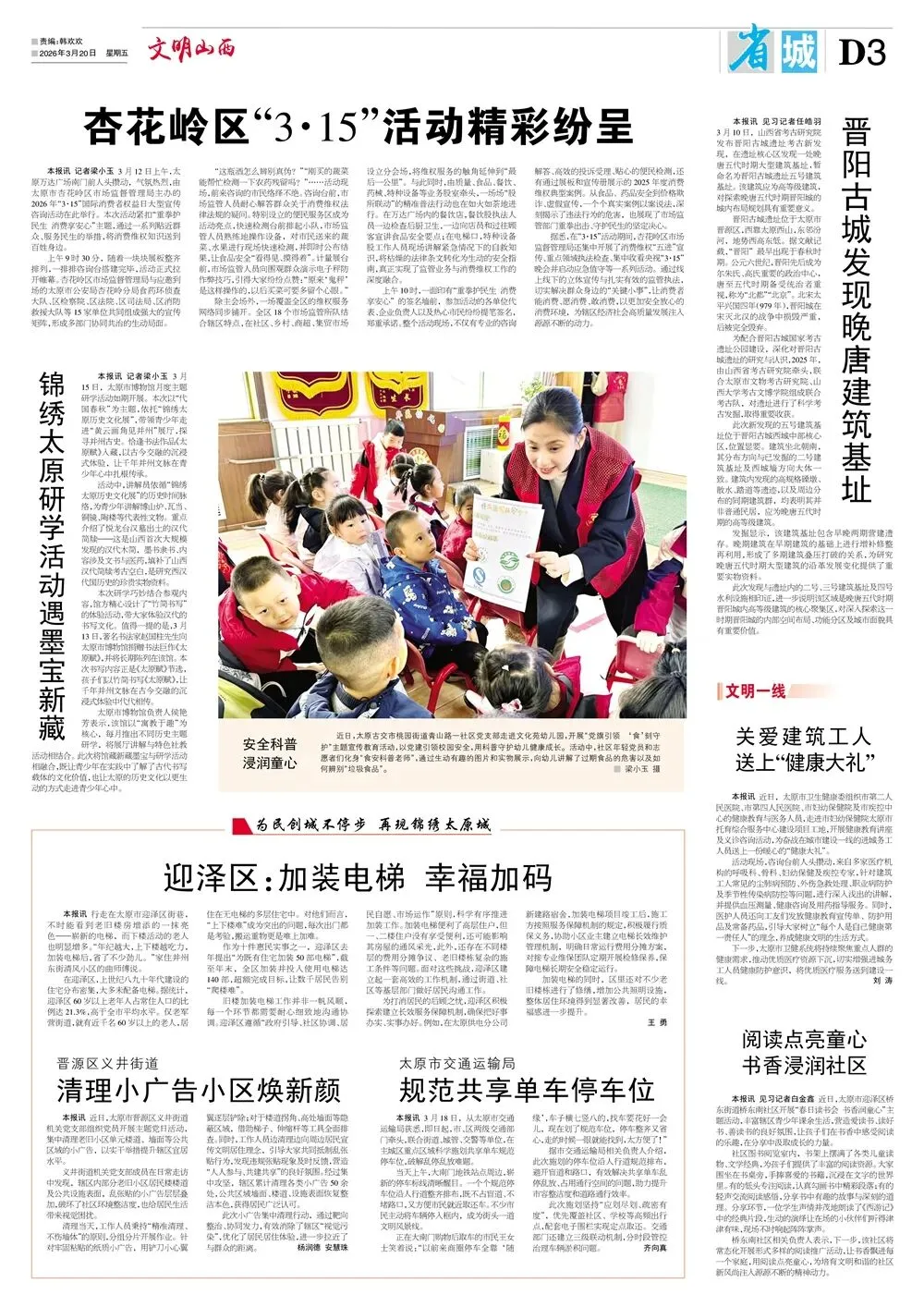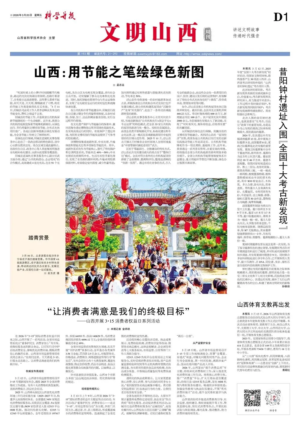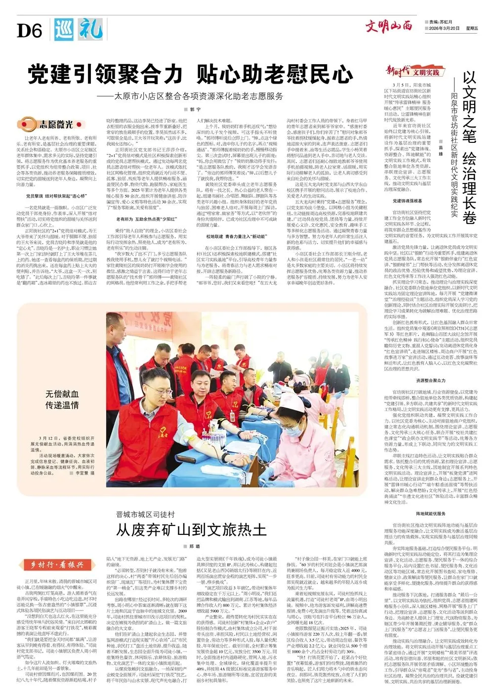 《文明山西》周刊3月20日电子版 核心提示 《文明山西》周刊由山西省文明办指导、科学导报社主办,是全省唯一的精神文明类报纸,对开八版,每周五出版,重点宣传山西省群众性精神文明“五大创建”活动、新时代文明实践中心建设、道德典型选树、学雷锋志愿服务等精神文明建设工作,兼顾报道全国各地精神文明创建活动先进经验和创新举措。 关注文明山西周刊视频号,观看更多精彩视频! 编 辑|郭 菲 审 核|常雅丽 ▍转载:如果转载请注明出处 ▍转载此图文仅为传递公众信息,若侵权请联系我们,我们将及时更正、删除,谢谢。 ▍邮箱:sxwmxyzk@163.com