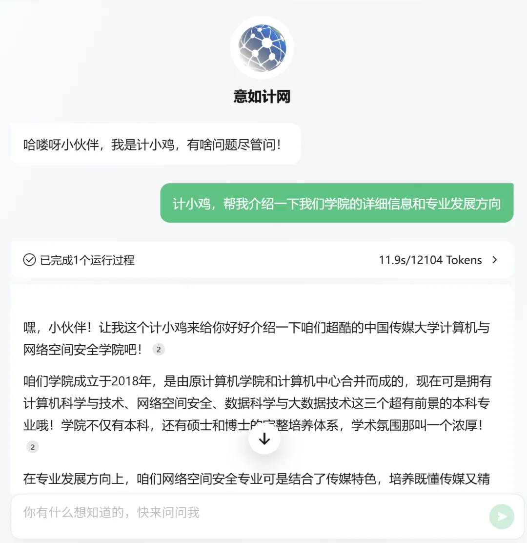 你的学院全能百事通 & 安全搭子,“意如计网”AI小助手,也会以大家超爱的计小鸡的视角来回答大家的各种问题!
