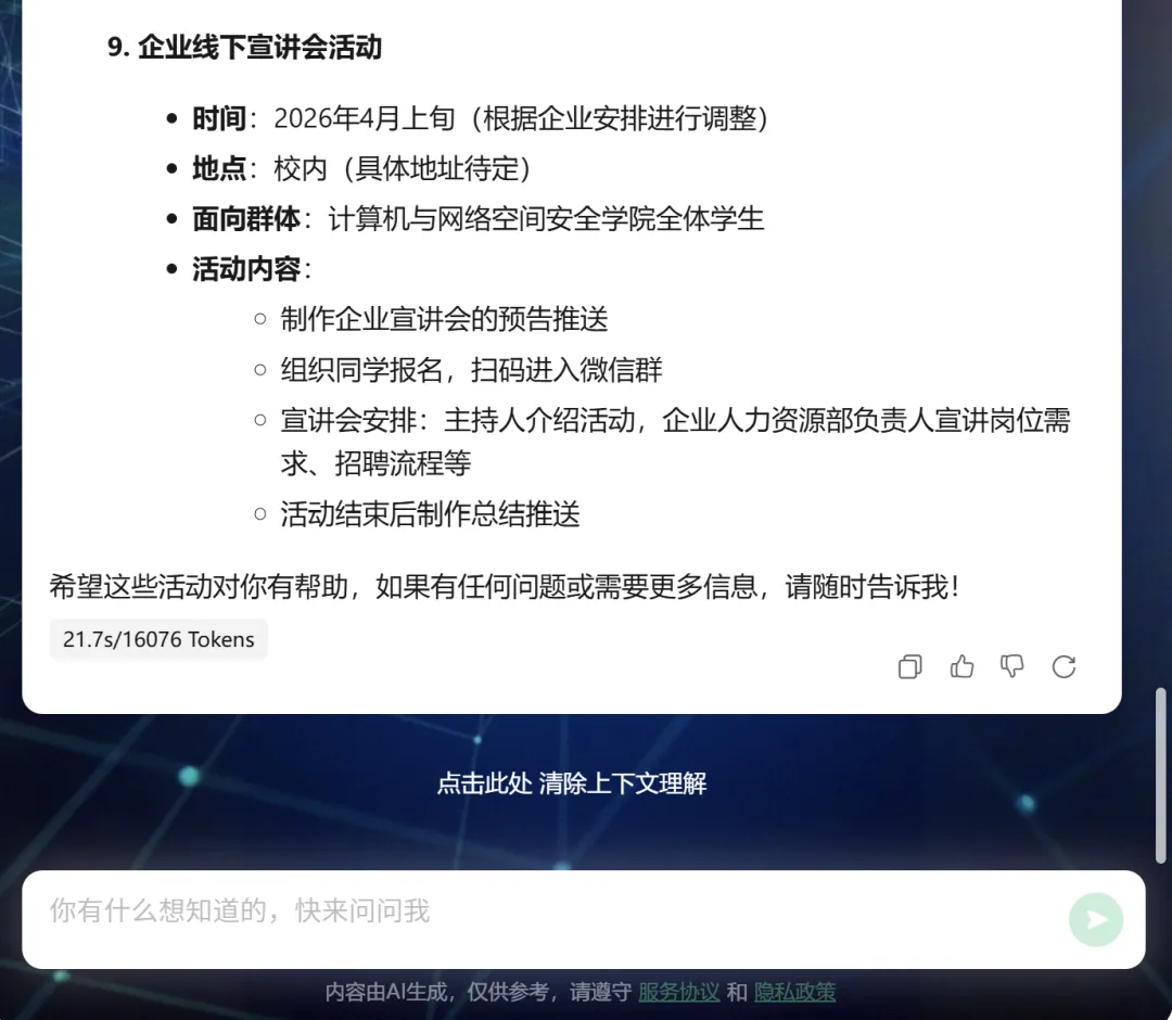 学术 & 活动引路人:不仅能生成权威的党风党建内容,还会组织安全知识竞赛、讲座等活动,用正能量带动大家探索前沿技术,活跃学院学术氛围。