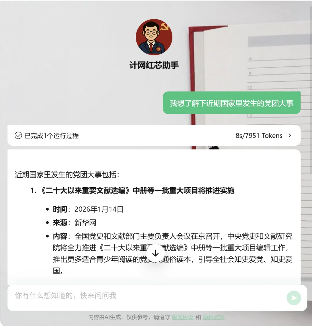 无论是日常理论学习、入党流程咨询,还是二十大精神的深度探讨,它都会用有温度的语言、有深度的内容,陪你走好每一步红色成长路。