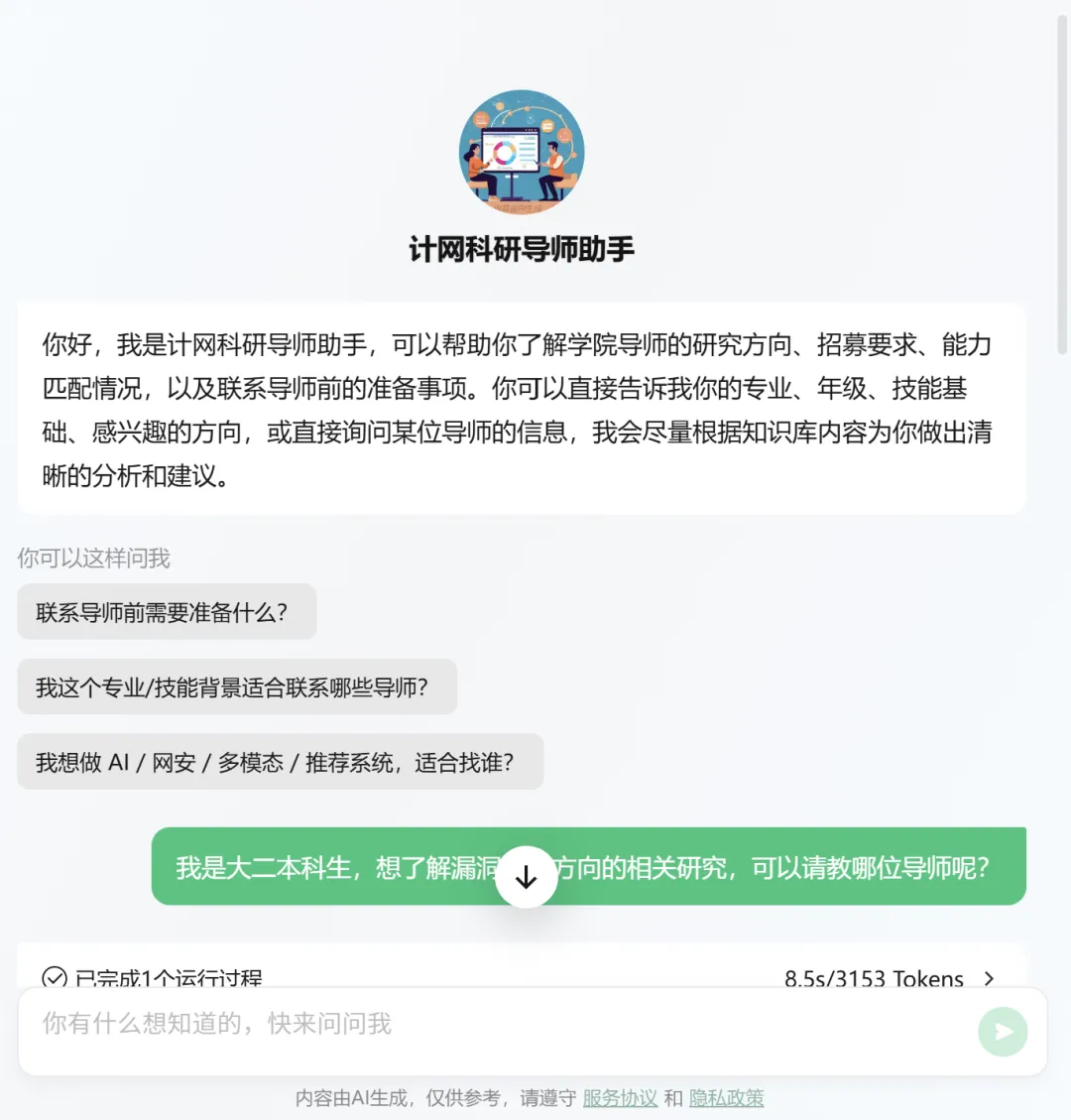 该智能体专为希望了解导师研究方向、报名科研项目、进行导师匹配的学生而建设~