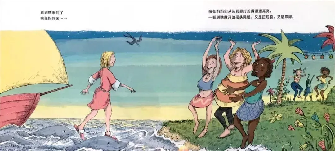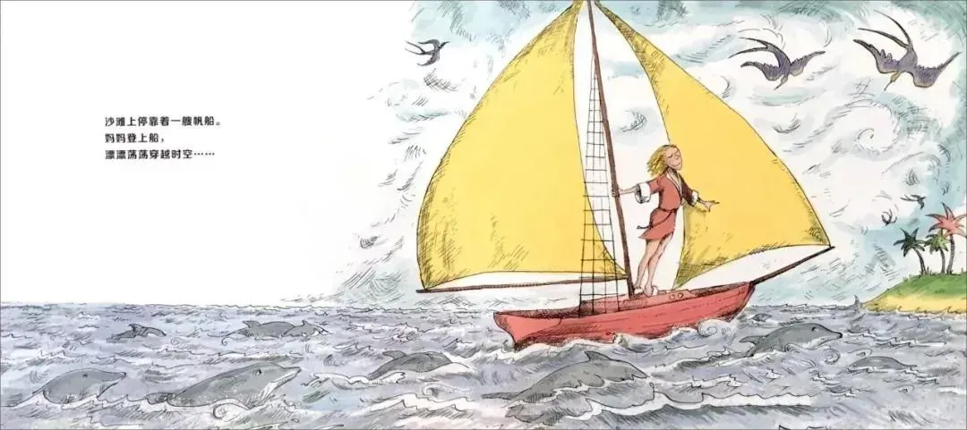 沙滩上停靠着一艘帆船。妈妈登上船,飘飘荡荡穿越时空……