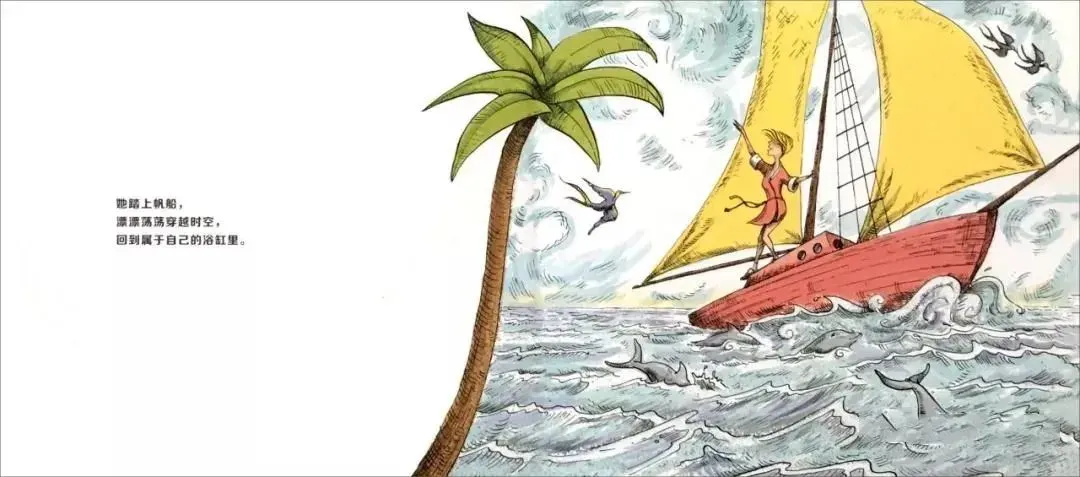 她踏上帆船,飘飘荡荡穿越时空,回到属于自己的浴缸里。