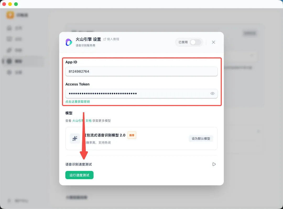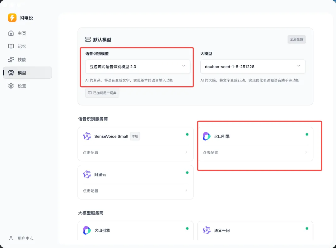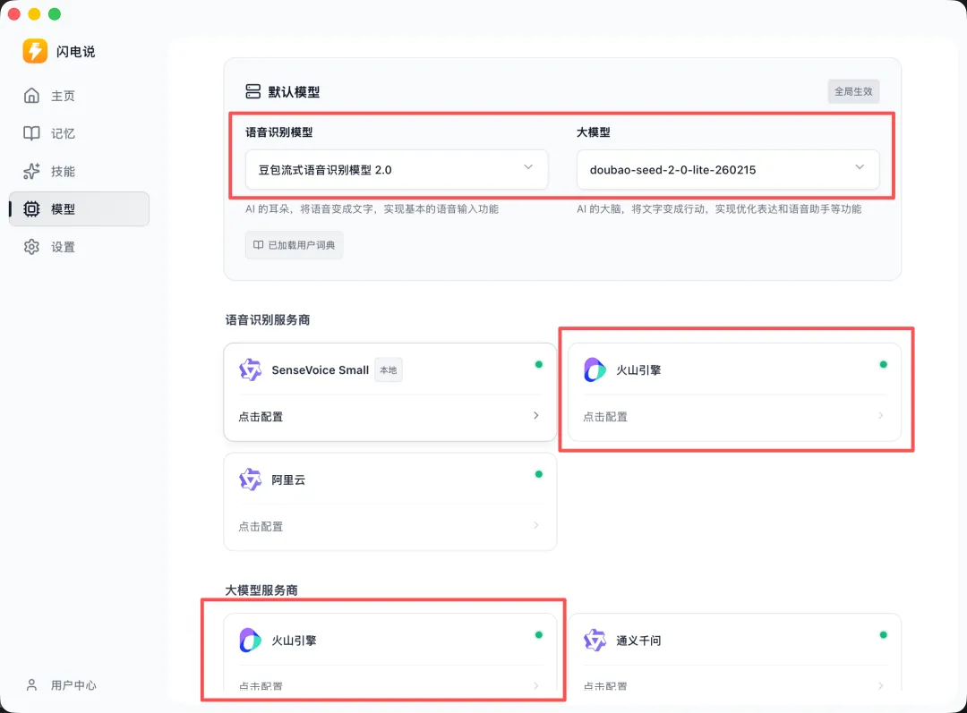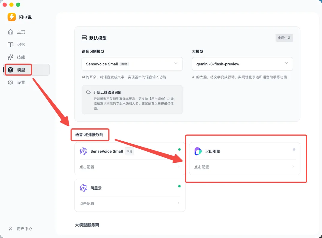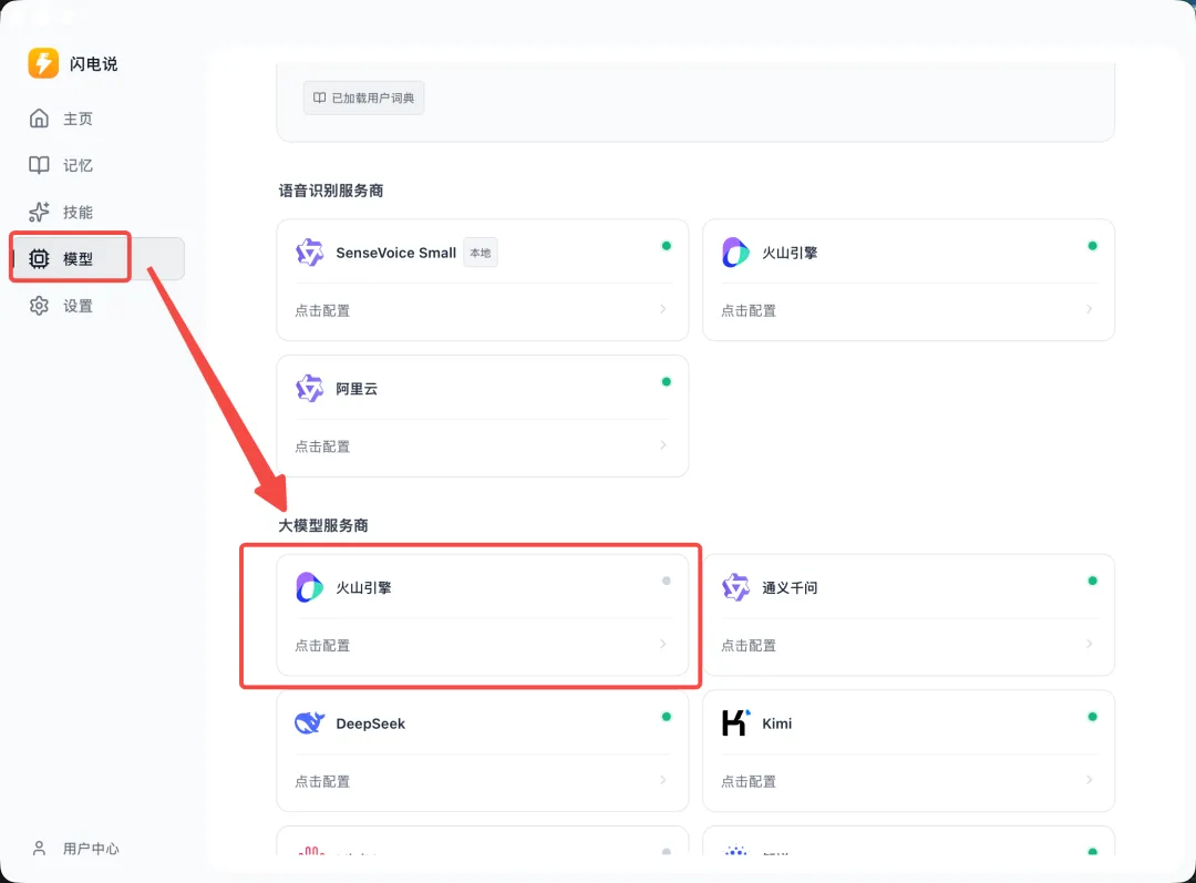 - 打开闪电说 APP,点击左侧的模型,在语音识别服务商里面找到火山引擎,点击打开