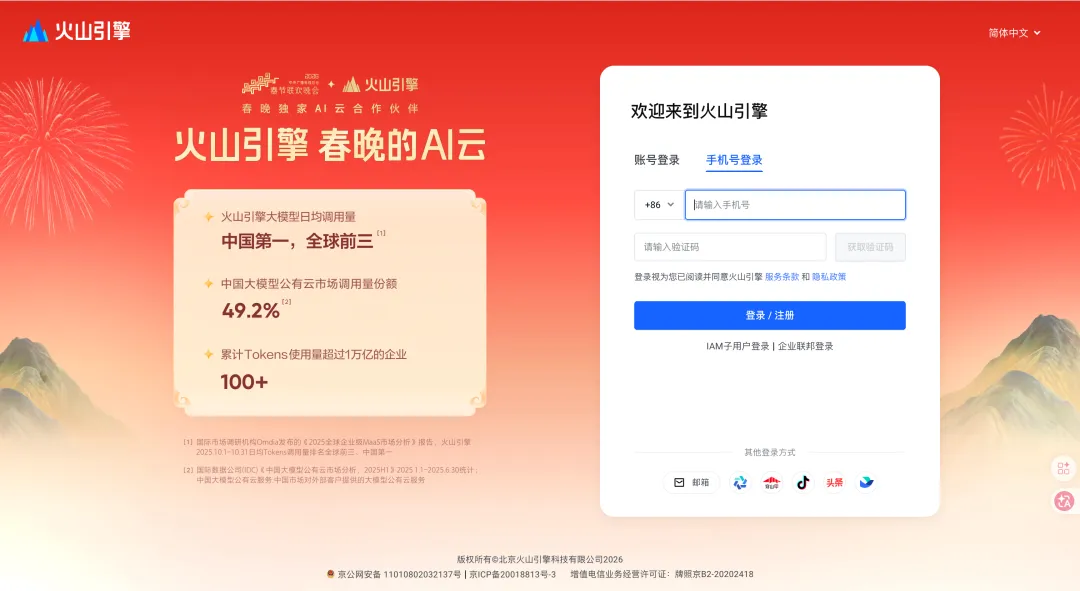 - 打开字节的云服务火山引擎,点击这里:火山引擎官网,您会看到下面这个登录页面,然后正常使用手机进行登录注册就好了。