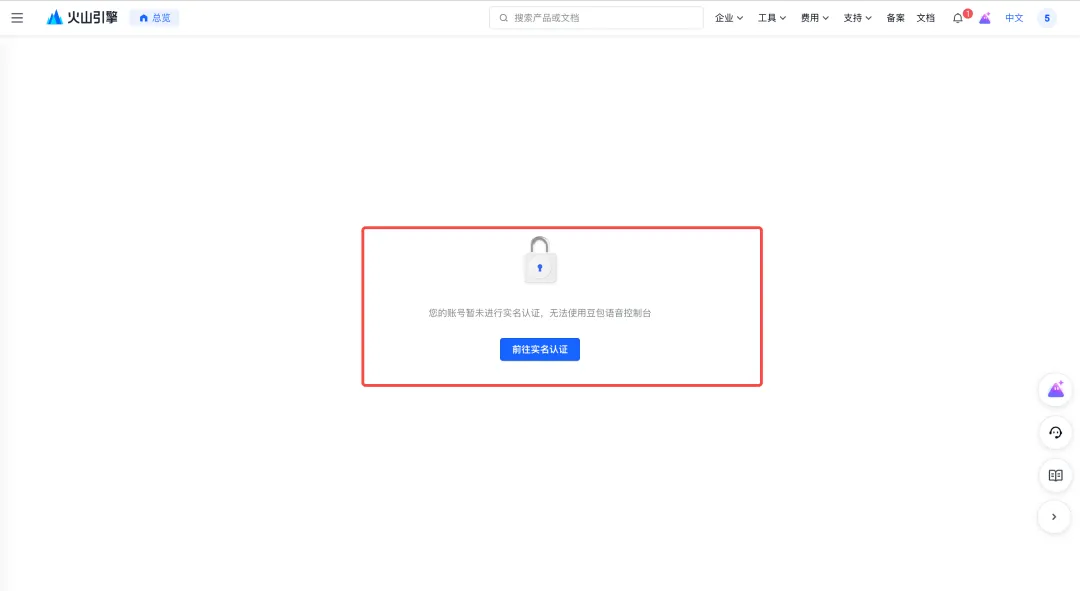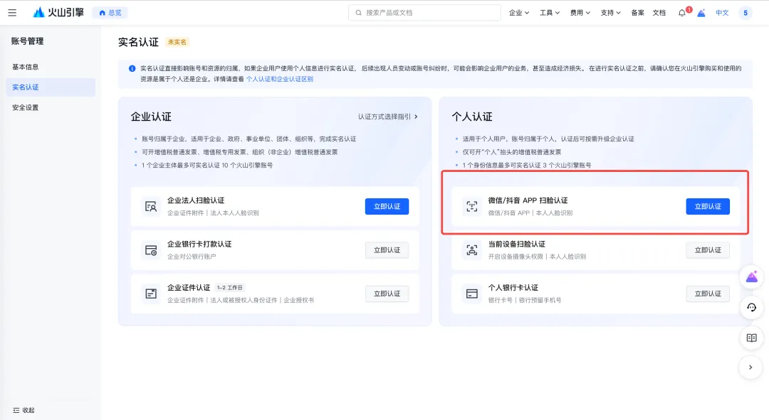 先点击”前往实名认证”,再点击“微信/抖音扫脸认证”就可以了。字节的所有 API 开通都是需要实名认证的。这里认证过一次之后,以后就都非常方便了。