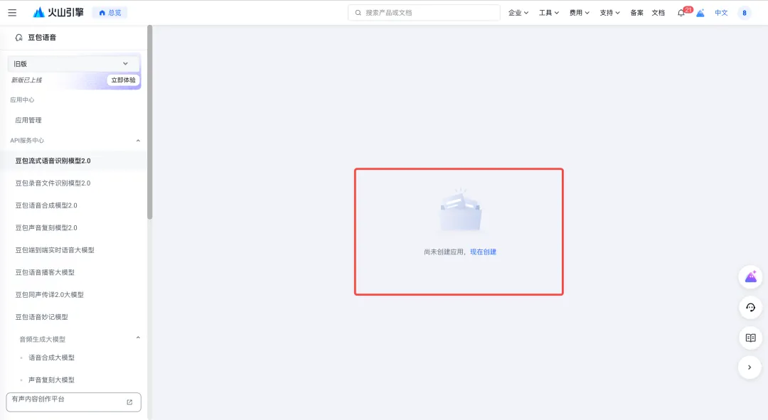 - 认证完成之后,再回到“豆包语音”。如果不知道怎么回去,点击这里:豆包语音。然后直接点击最中间的创建应用。