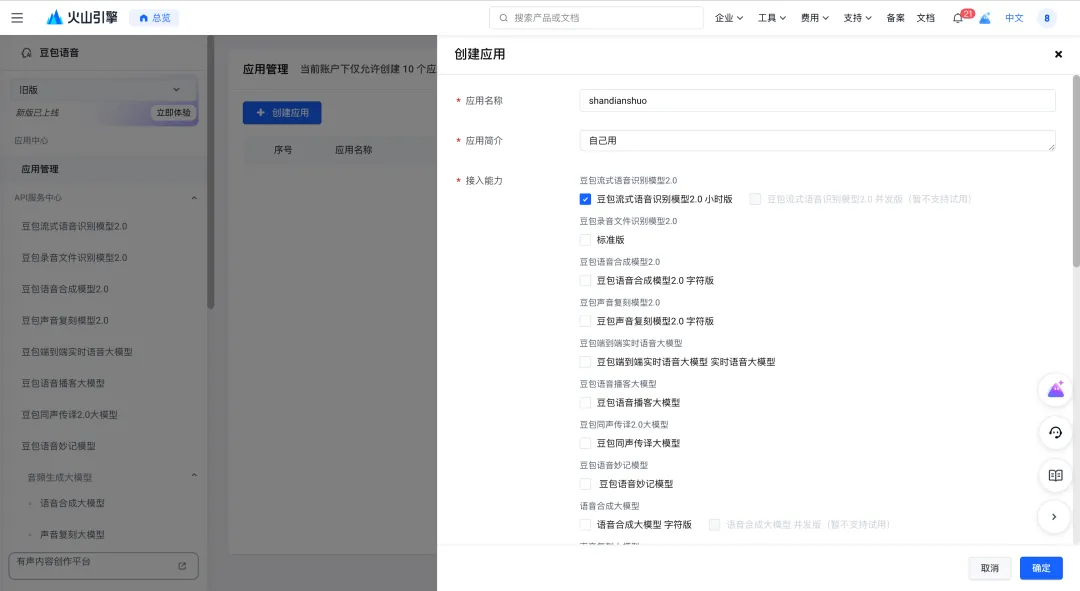 - 在创建应用里面,应用名称填“shandianshuo”(只支持英文),应用简介写“自己用“,接入能力选择:”豆包流式语音识别模型2.0 小时版“。点击右下角的“确定”,就把应用创建好了。