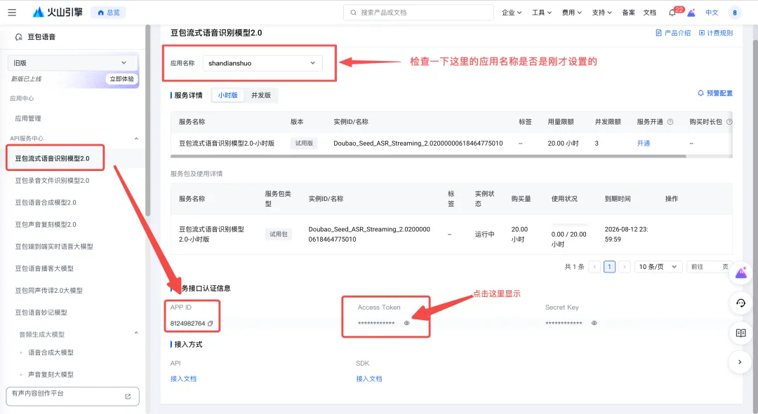 - 创建成功之后,您把这个创建应用的页面在右上角给叉掉。然后在左侧的 API 服务中心的菜单里面点到第一个”豆包流式语音识别模型 2.0”。就可以看到下面这个页面了,把这个页面滑到底部,您就能找到最开始我们在闪电说的配置里给您看的 App ID 和 Access Token(正常情况下是隐藏的,点击小眼睛可以打开) 。Access Token 是您的密码,一定要保存好,也不要告诉任何人。目前在字节火山引擎这个版本里面给您提供了 20 小时的免费额度,可以使用很久了。注意:检查一下这里的应用名称是否是刚才设置的,因为是可以创建多个应用的