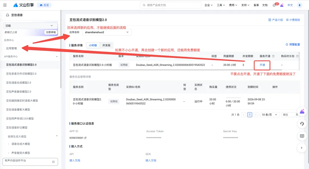 千万不要点击服务开通,这个服务开通的意思是,开通付费版本,开通了之后就不能用免费的试用的20h额度了。如果不小心开通了,按照下图指示,去左侧应用管理再创建一个新的应用,然后回到本页面,在应用名称那里选择你最新创建的应用即可,可能重名,一定要检查清楚,主要检查服务的是否显示“开通”(显示“开通”表示还没有开通)。然后可以继续后面的操作。