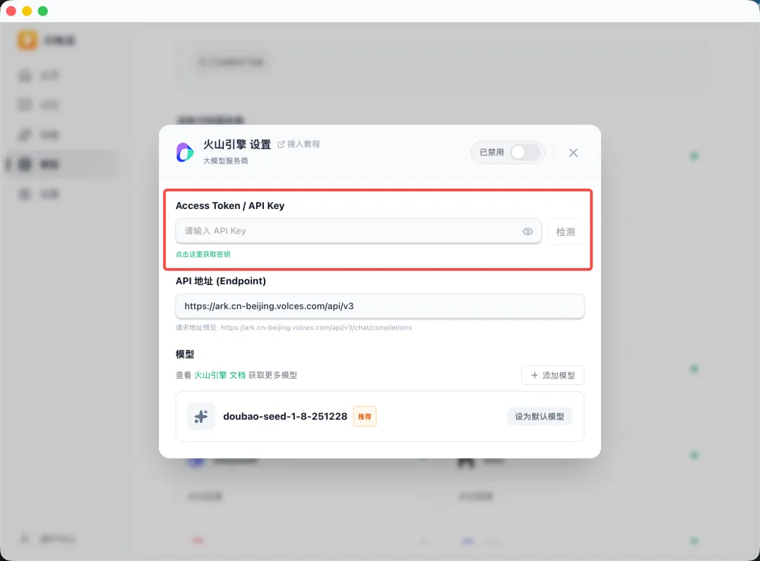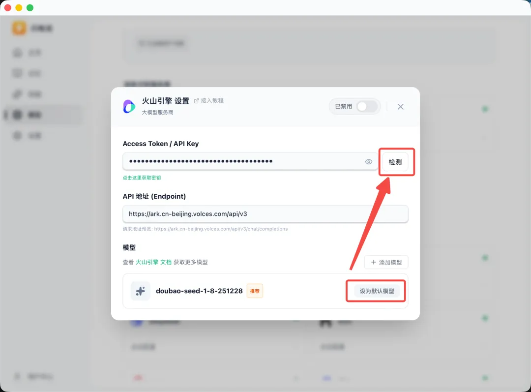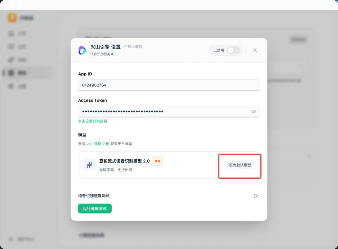 - 回到闪电说 APP,把刚刚获得的 API Key 填进去。先点击设为默认模型,把豆包 2.0 应用上。