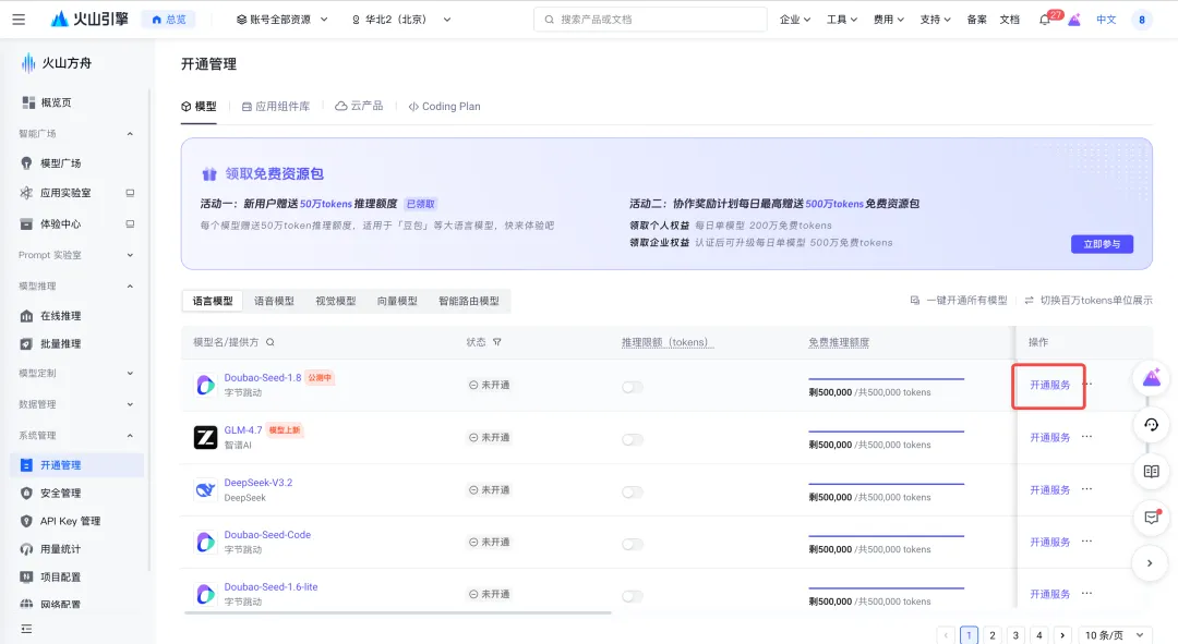 - 鉴于您刚刚已经进行了火山引擎的登录和实名认证的步骤,所以我这里直接引导你进入大模型的开通页面。打开字节火山引擎的 AI 开通页面,点击这里:火山方舟开通管理页面。