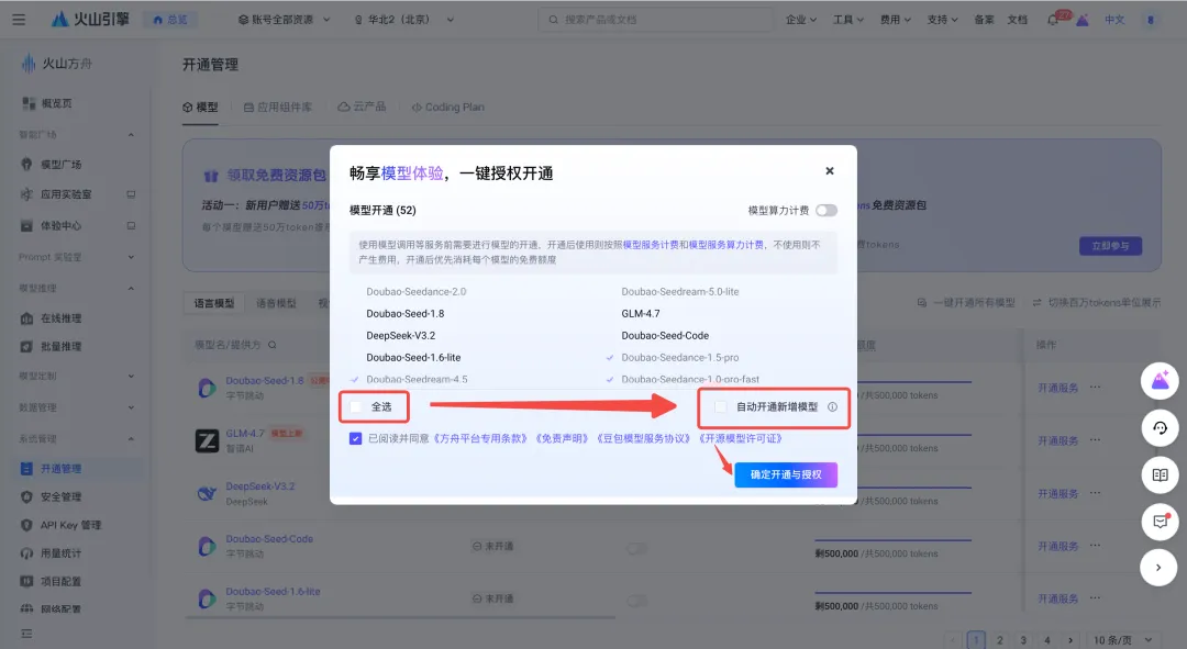 - 然后在开通服务的页面,为了方便以后更加简单易用,可以先点击”全选”,然后点击”自动开通新增模型”,最后点击”确定开通与授权”。这样不管以后就是需要用什么新模型,你都可以直接用了,就不用再做进一步的配置了。