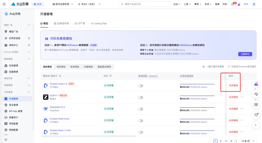 - 然后在开通管理页面检查一下,看看这个模型是否已经开通成功。开通成功之后,操作那里会变成,会从”开通服务”变成”关闭服务”。如果出现意外情况没有开通服务,可以重新再走一遍刚刚那个流程。同时,字节提供了50万 token 的额度,也可以用很久了。