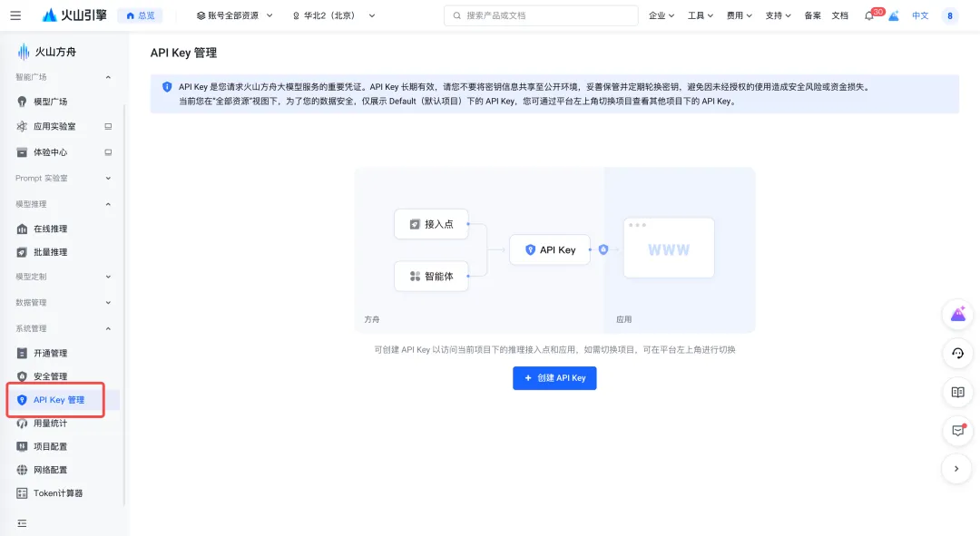 - 在”开通管理”下方有一个 “API Key 管理”,点击它。然后进到页面里面之后,点击”创建 API Key”。